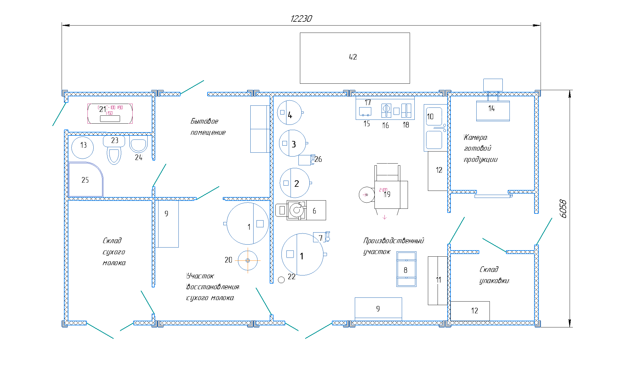 укомплектован всем необходимым оборудованием и коммуникациями для полного технологического цикла переработки молока. Цех соответствует санитарно-гигиеническим требованиям Роспотребнадзора, техническому регламенту Таможенного союза «О безопасности молока и молочной продукции» (ТР ТС 033/2013), нормам пожарной и электробезопасности, правилам безопасности труда. Оборудование цеха и молокопроводы изготовлены из высококачественной пищевой нержавеющей стали.