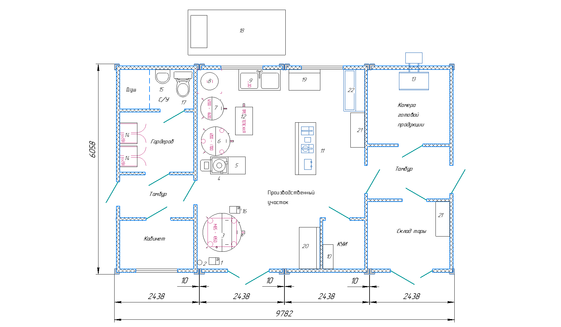 Молочный цех К-1000.3.10 (Стандарт, ПЭТ, стаканчики, без общей кровли, ГЛВ, склад тары, холодильная камера, бытовые, кабинет, КУИ, творог, кефир, сметана, молоко, масло, сыр мягкий)
