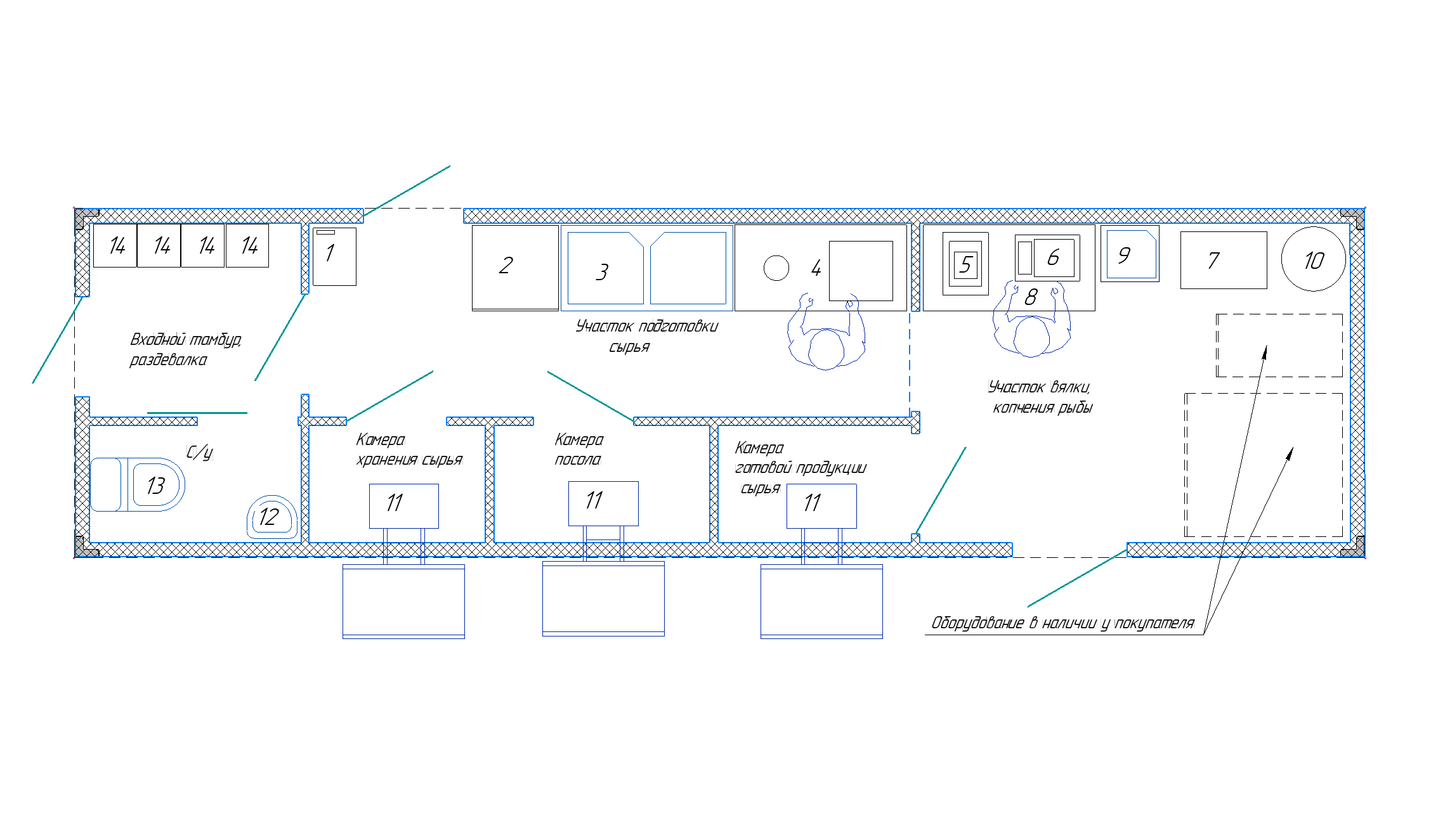 представляет собой здание на основе восстановленного морского контейнера, с использованием современных утеплителей и отделочных материалов. Цех укомплектован всем необходимым оборудованием и коммуникациями для полного технологического цикла переработки сырья. Цех соответствует санитарно-гигиеническим требованиям Роспотребнадзора, пожарным нормам, электробезопасности, правилам безопасности труда.