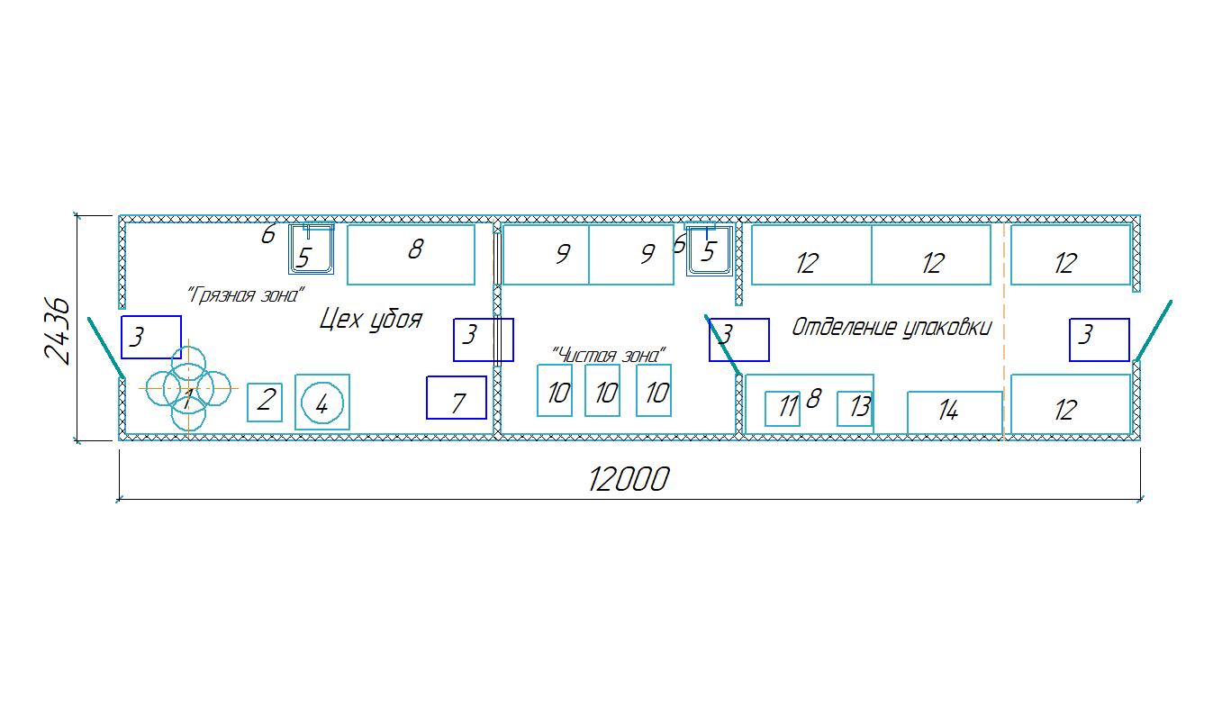 представляет собой здание на основе металлокаркаса, с использованием сэндвич панелей в качестве ограждающих конструкций. Цех укомплектован всем необходимым оборудованием и коммуникациями для полного технологического цикла переработки. Цех соответствует санитарно-гигиеническим требованиям Роспотребнадзора, техническому регламенту Таможенного союза «О безопасности мяса и мясной продукции» (ТР ТС 034/2013), нормам пожарной и электробезопасности, правилам безопасности труда.