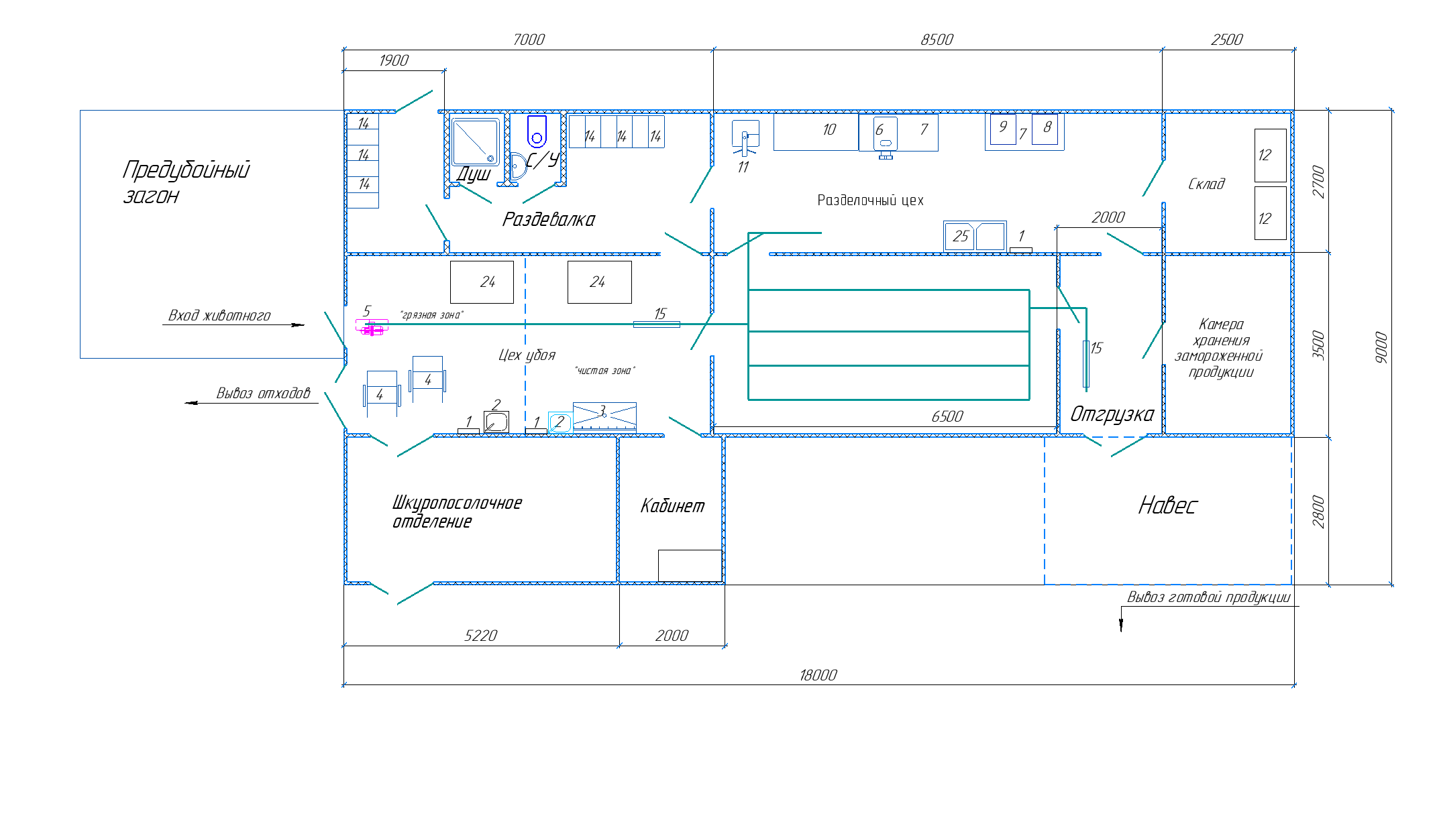 Убойный цех УМЦ-60.2 (60 МРС, убой, холодильник, обвалка, полуфабрикаты, бытовые, шкуропосол, предубой)