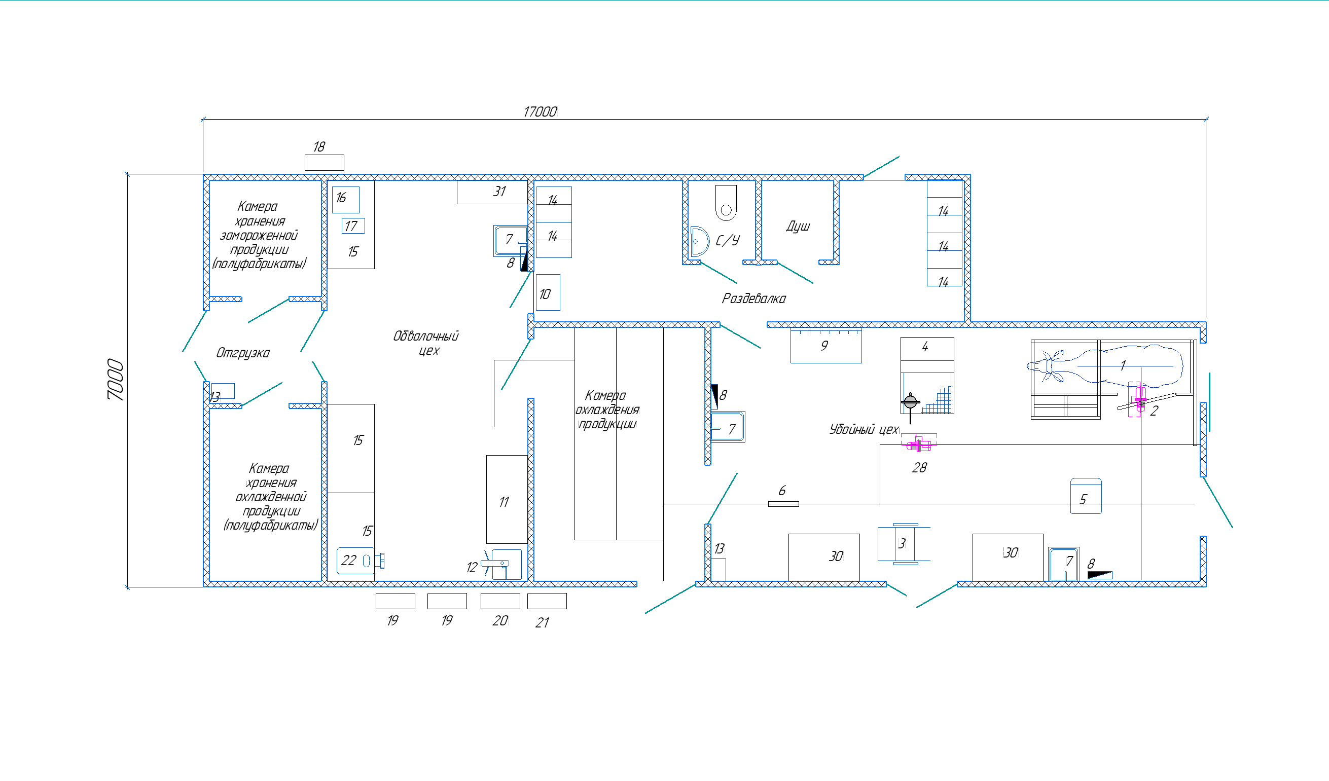представляет собой здание на основе металлокаркаса, с использованием сэндвич панелей в качестве ограждающих конструкций. Цех укомплектован всем необходимым оборудованием и коммуникациями для полного технологического цикла первичной переработки мяса. Цех соответствует санитарно-гигиеническим требованиям Роспотребнадзора, техническому регламенту Таможенного союза «О безопасности мяса и мясной продукции» (ТР ТС 034/2013), нормам пожарной и электробезопасности, правилам безопасности труда.